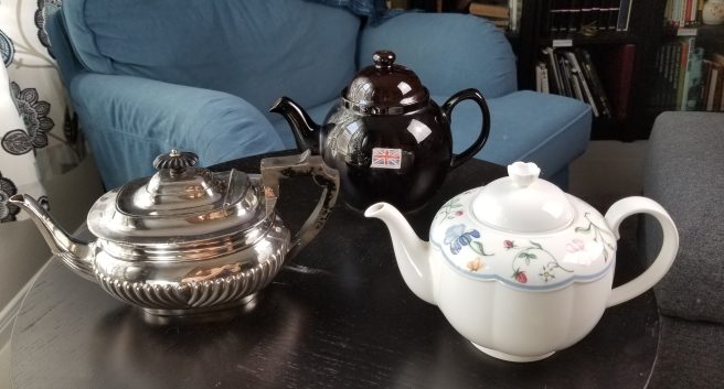 This time I went for my same Mariposa porcelain Villeroy & Boch teapot, and added my Brown Betty (well seasoned after serving many cups of afternoon tea), and a silver-plated Edwardian-style teapot. (Didn’t bother with glass or cast iron teapots, simply because they are not my preferred to use.)