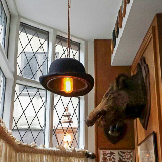Think 19th Century Explorer’s Club meets Victoriana fantasy: Antique bicycles, animal heads, top hat “chandeliers” are sprinkled throughout, not to mention a nod to Phileas’ Fogg’s world-traveling balloon hanging from the ceiling at one end of the room.
