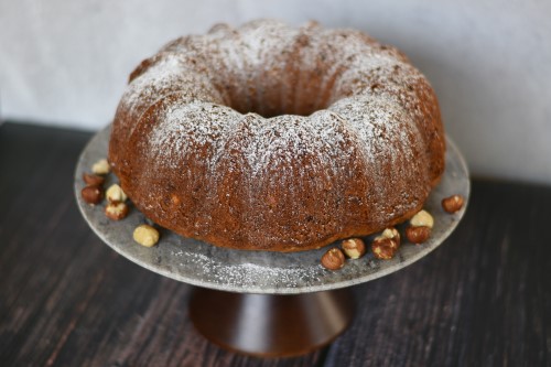 Spoon the batter into a greased bundt pan, smoothing out the batter before putting into the oven. Bake 45-50 minutes (check at 45 minutes; if a toothpick comes out clean and it’s medium brown in color, it’s done).
