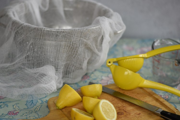 For the Paneer: Take a large, double-layered square of your cheesecloth (at least a 16″x16″ square), and line a colander with the cloth; set it in the sink.Prep the lemons before you heat the milk – cut and juice 2-4 lemons (depending on size of lemons) until you have 1/4 cup. Have ready next to the stove where you’ll heat the milk.