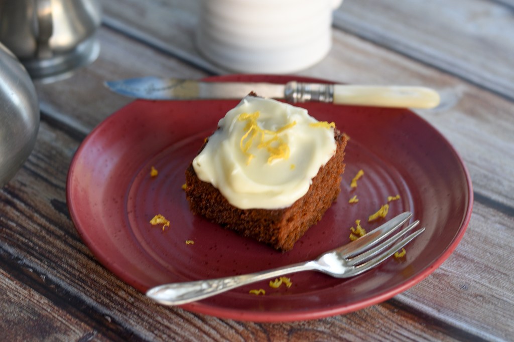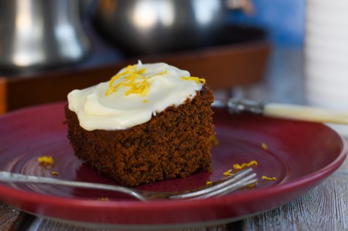 Assembling the cake is pretty straightforward. My version below includes a few tweaks from the original – I added additional spices like nutmeg, cloves, and a good bit of crystallized ginger. And while the colonists would have been more likely to simply drizzle over some cream, I made up a quick-and-easy cream cheese frosting with lemon peel, which goes so well with gingerbread.