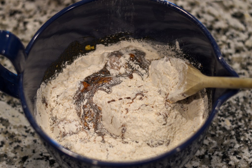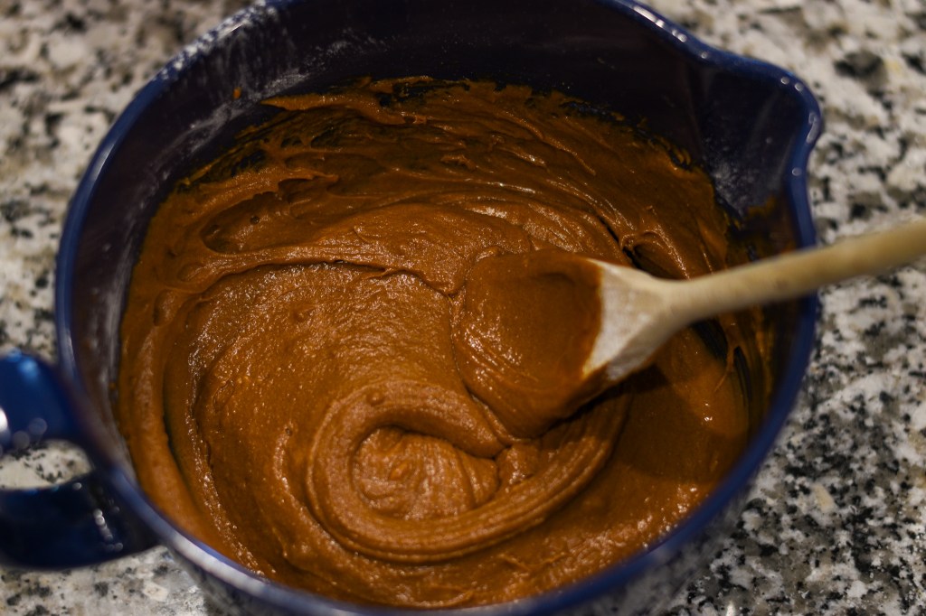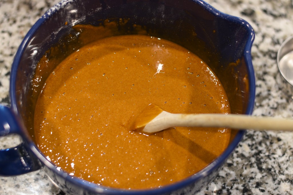 In a large bowl, combine the molasses and eggs well with a wooden spoon. Add all other ingredients except the baking soda and water; stir them well until the mixture is smooth and thick, about 40 strokes. Then add in the baking soda/water mixture and stir until smooth, or about 1 minute. The mixture will be quite liquid after you’ve added the water/baking soda; this is all right.
