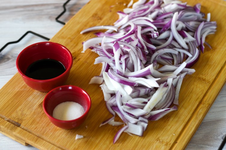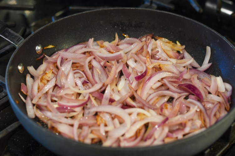 To make the caramelized onion: Slice the red onion into thin strips or dice into small pieces. Saute the sliced onion in olive oil over low heat until soft.Add the sugar; stir until the onions are coated, then add the balsamic vinegar. Cook until reduced.