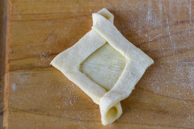 I simply searched YouTube for a “how to make puff pastry diamonds” video to figure out how to cut the puff pastry to make this shape, which suits these ingredients perfectly. Below are my pictures of the process.