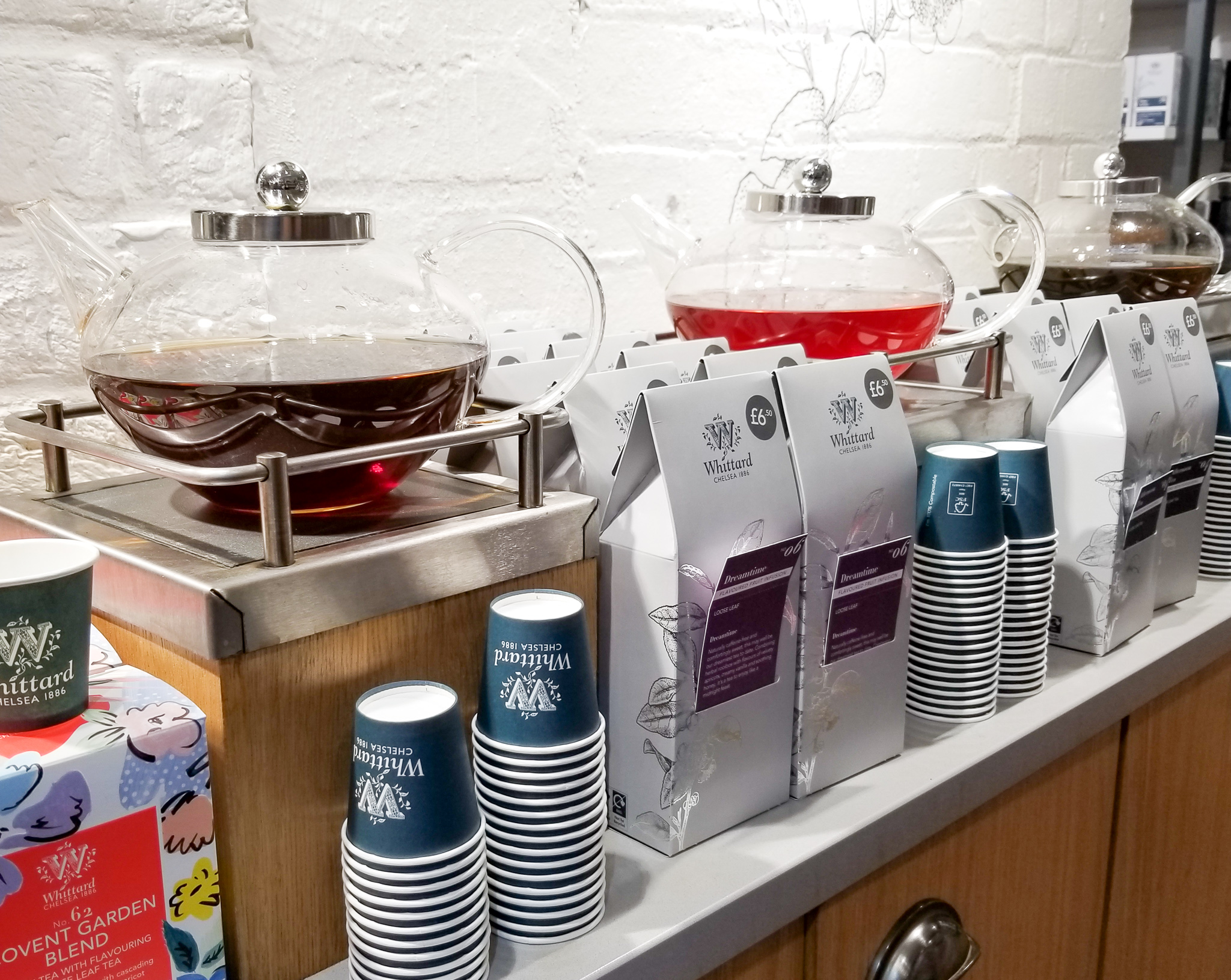 Call me a tea geek or what you will, but I loved the little paper cups with their logo that were in abundance at every tea-tasting station! And there were plenty of teas to try; they seemed to be around every column or framing our view out the windows to the rest of Covent Garden. And not only tea, but their specialty hot chocolate varieties were on hand to try as well.