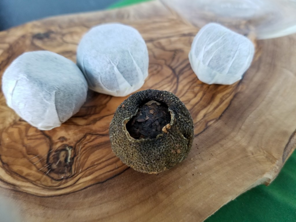 A friend of mine went to China several years ago and told me about a tea she bought where the tea was packed into the rind of an orange and you brewed it whole in the orange. A pretty exotic-sounding tea to this American, but intriguing – and something I’ve wanted to try ever since.