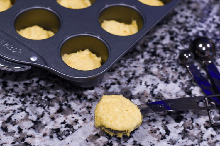 You may wish to prepare your mini-cake molds with butter and flour and/or parchment; or if you have a nonstick tin, such preparation may not be necessary. Once the batter has chilled, use a heaping tablespoon to fill each mold so that they are filled about halfway.