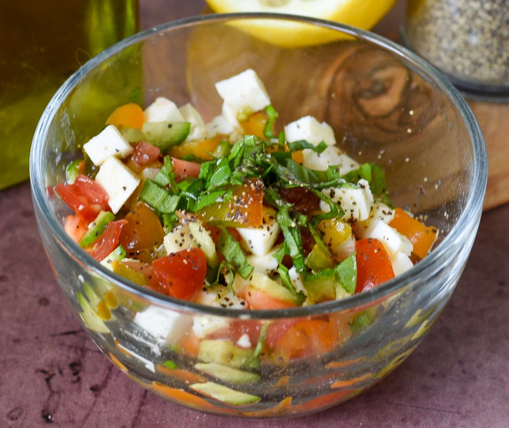 Mine is not a pure “caprese”, as I did add a bit of cucumber (from the small Persian kind, which are fab!). I’m always looking for ways to integrate cucumber into my diet – just a favorite food. I also squeezed a little fresh lemon over it as well.