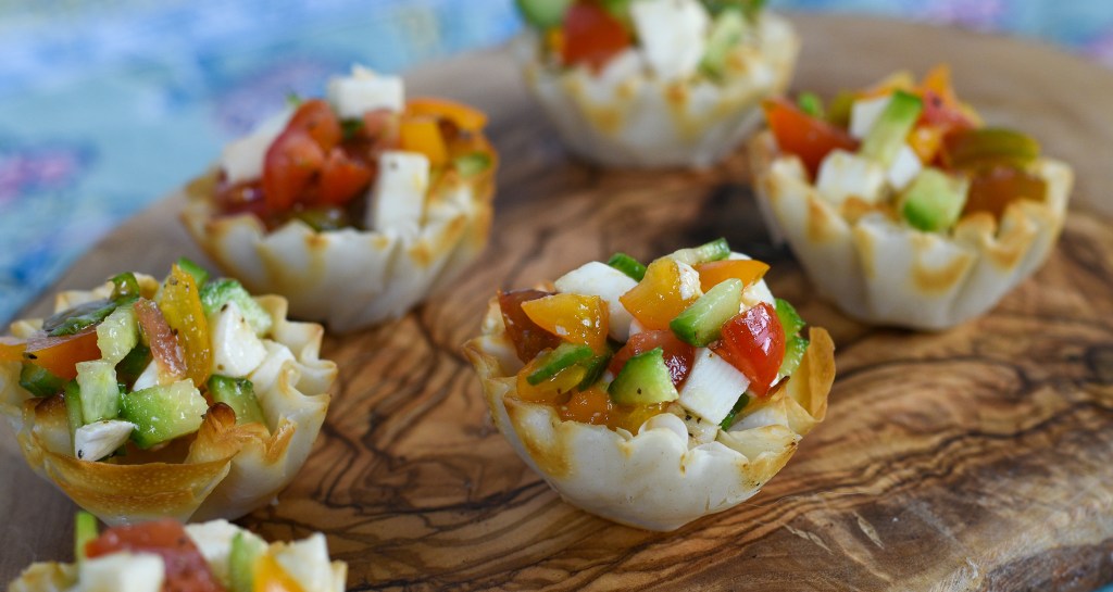 I chopped the pieces of tomato, cucumber, and mozzarella quite small, given the pre-formed phyllo cups are literally one bite.