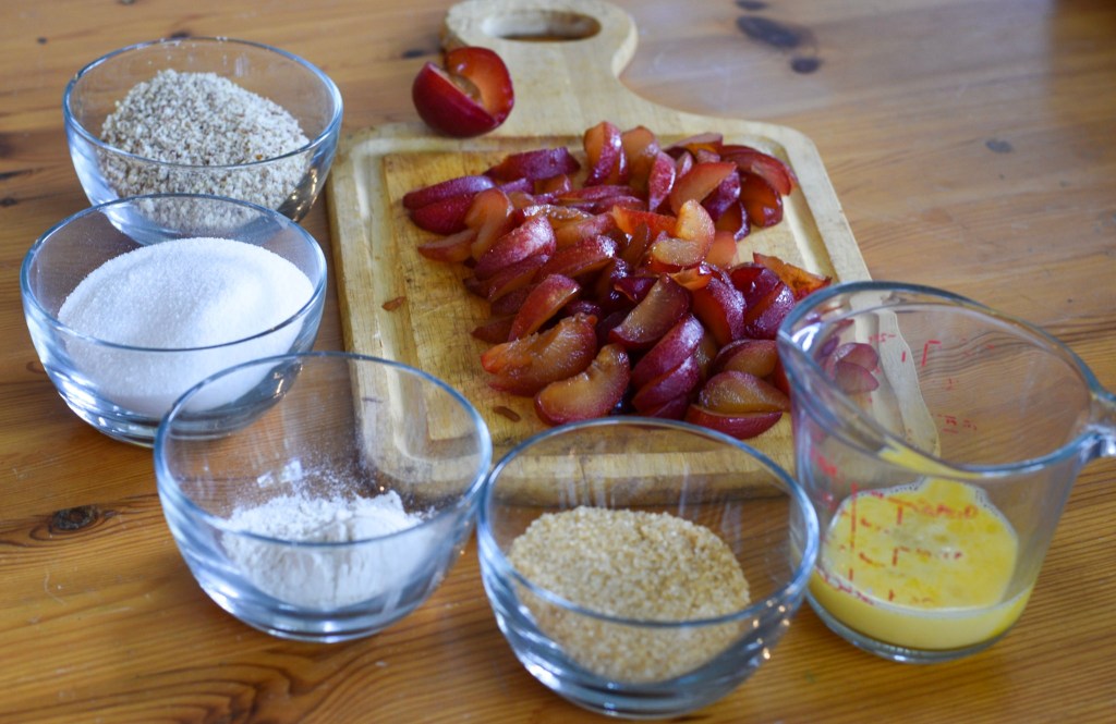 Plums, peaches, or other fruit are sliced up so they can be laid out in rows. The almonds are pulsed to very fine pieces – almost a flour. The wheat flour and almonds help absorb the juices of the fruit, keeping them from seeping so much into the bottom of the tart so one doesn’t get a soggy bottom.