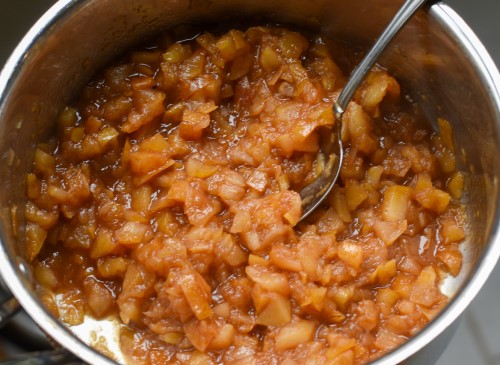 Making the crab apple sauce is as easy as it gets – just slice up into very small pieces (for getting through a largish piping tip), and mix all the ingredients together, bringing the liquids to a boil, then simmering until it reaches the consistency you like.