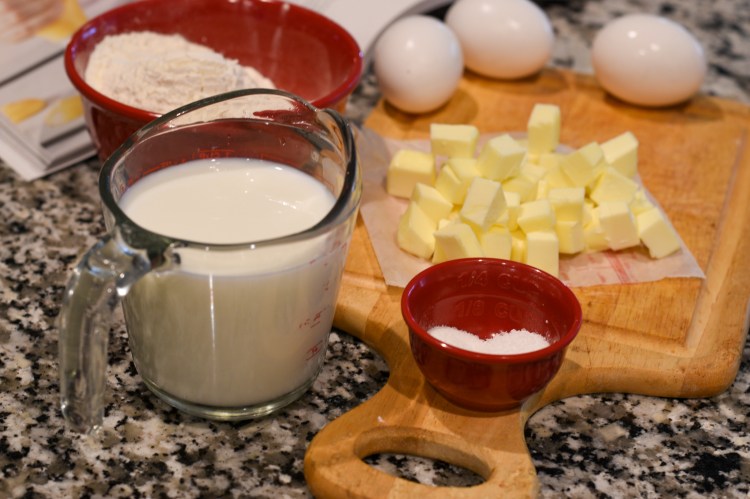 Preheat your oven to 375 degrees Fahrenheit. Sift the flour and the salt together and set aside. Heat the water, milk, butter and sugar in a saucepan on the stove. Bring it to a boil, removing it from the heat as soon as it boils and adding the flour/salt.Add the flour all at once, stirring it with a strong spatula or wooden spoon to bring the mixture all together into a ball. Return to the heat and stir for another 30 seconds to 1 minute until the dough leaves the side of the pan, and a slight film covers the bottom of the pan.