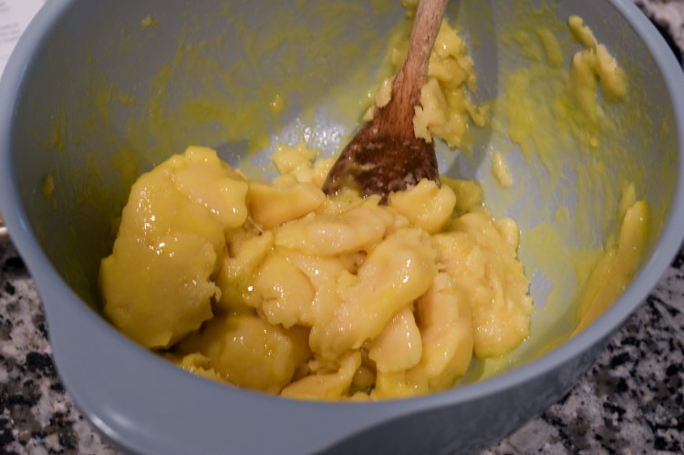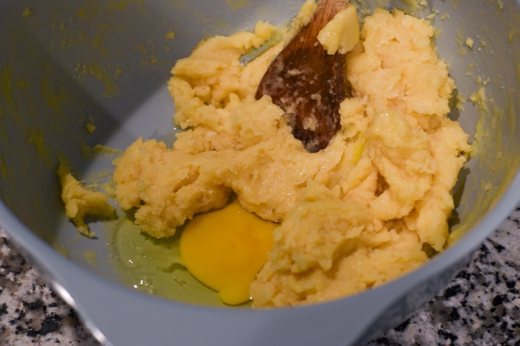 Add the eggs one at a time, stirring or mixing them in completely before adding the next one. Add at least 3 eggs, then test whether you need more by taking your wooden spoon and scooping up a large amount of dough, then holding it on its side to let the dough drop back into the bowl. If it’s the right texture, the dough will drop in a “V” shape off the spoon, and be silky smooth in texture.