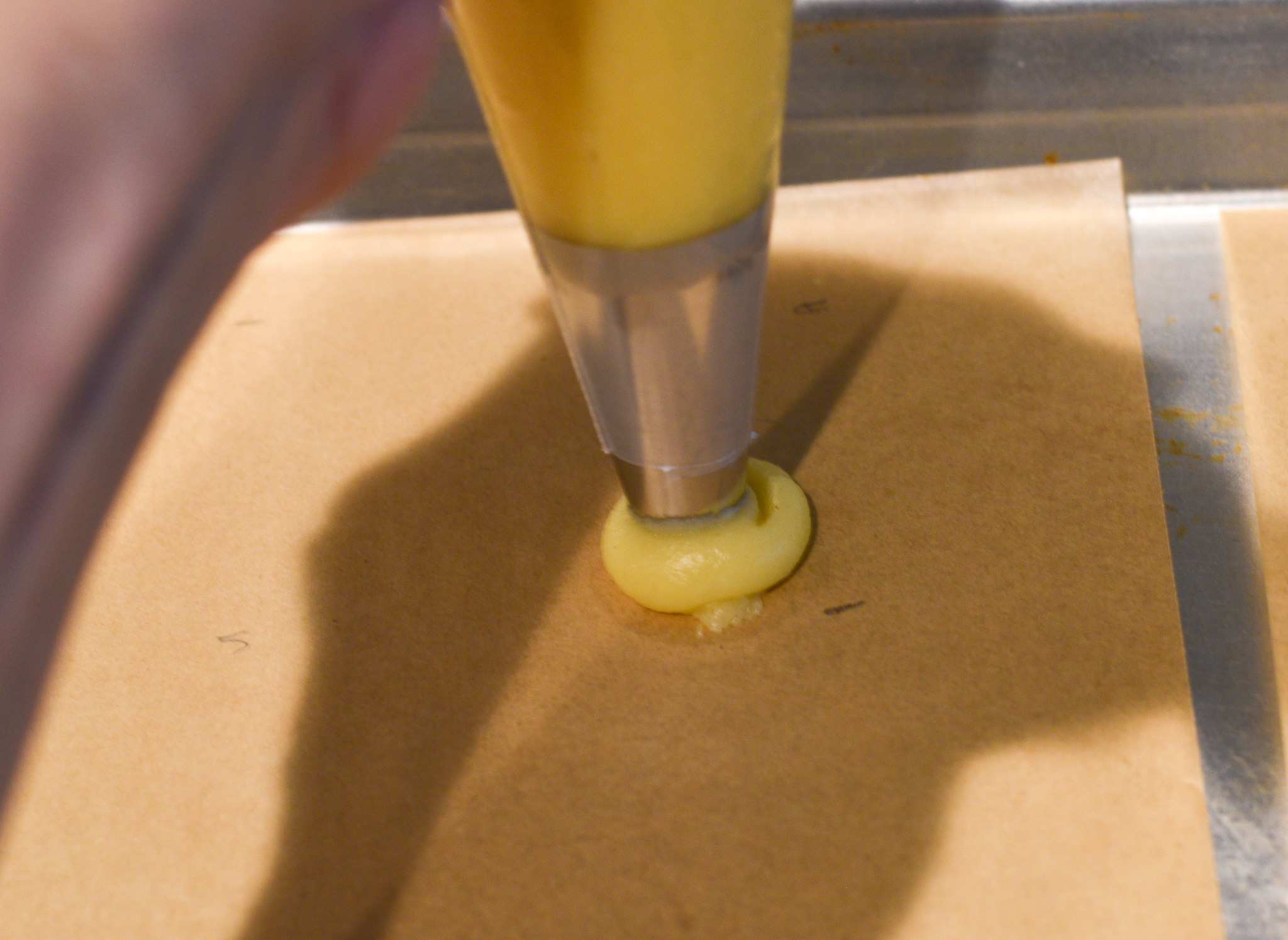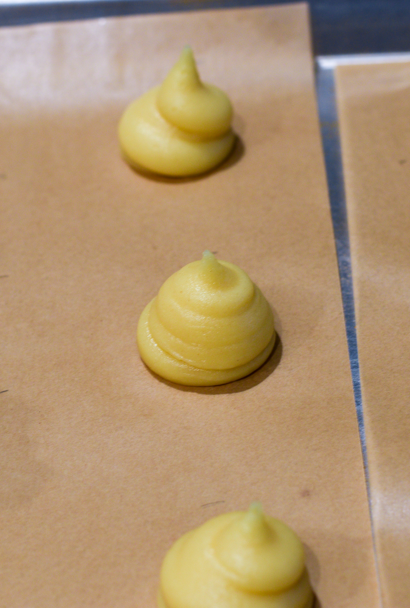 Pipe onto a parchment-lined baking sheet in 2-inch circles that stand about 1-inch high. Keep each mount at least an inch apart. Hold your piping bag straight up and perpendicular to the baking sheet, piping out the dough in one big round mound, before “swirling around” the top to release the bag. You will go around after and tap down any tips with a dampened finger at the end.