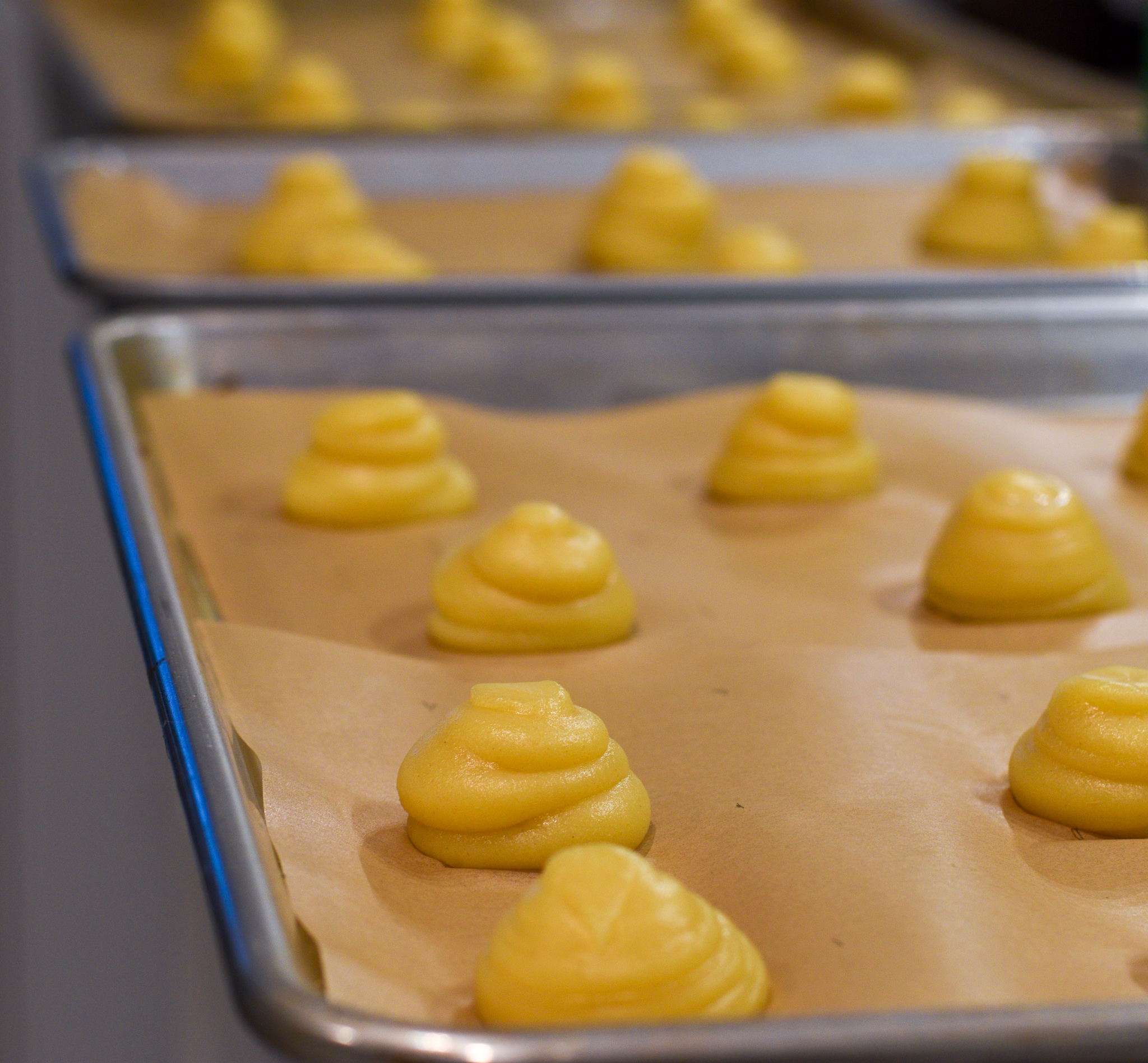 Once you’ve got the pastry pulled together, you want to use a piping bag to make your profiteroles. I like to use a tall glass, turn the piping tip up as I fill it. Make sure you pipe from a perpendicular position to get more consistent pastry mounds.
