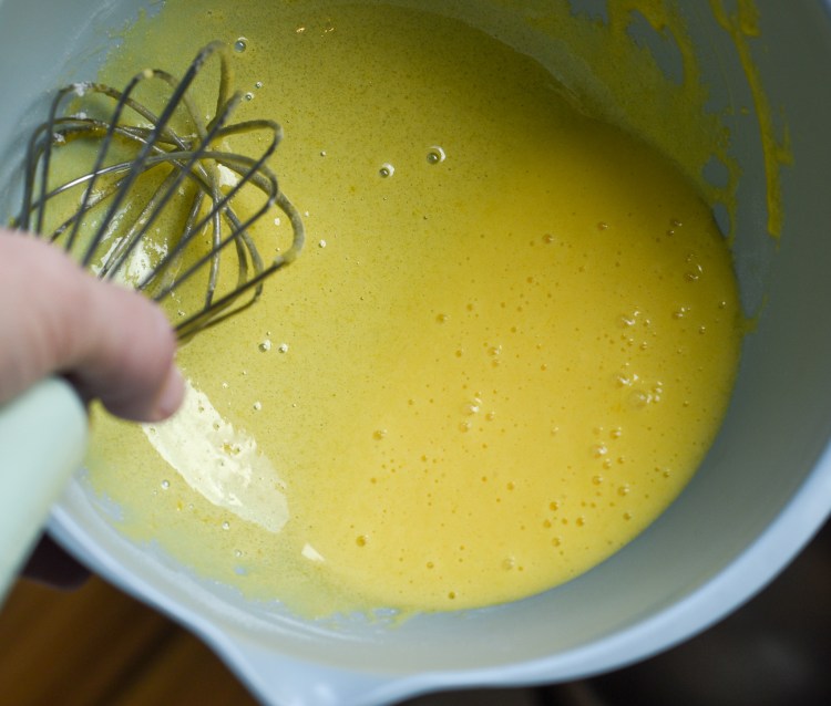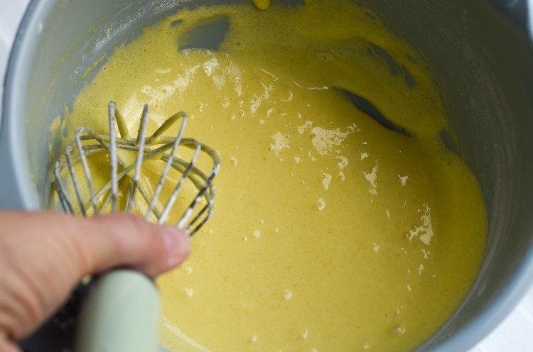 When it just comes to a simmer turn off the heat. While whisking, add this to the egg yolk mixture. Once incorporated, return the whole mixture back into the saucepan and bring it back to a boil, whisking while it heats. Once it comes to a boil, whisk for another 30 seconds before taking it off the heat.