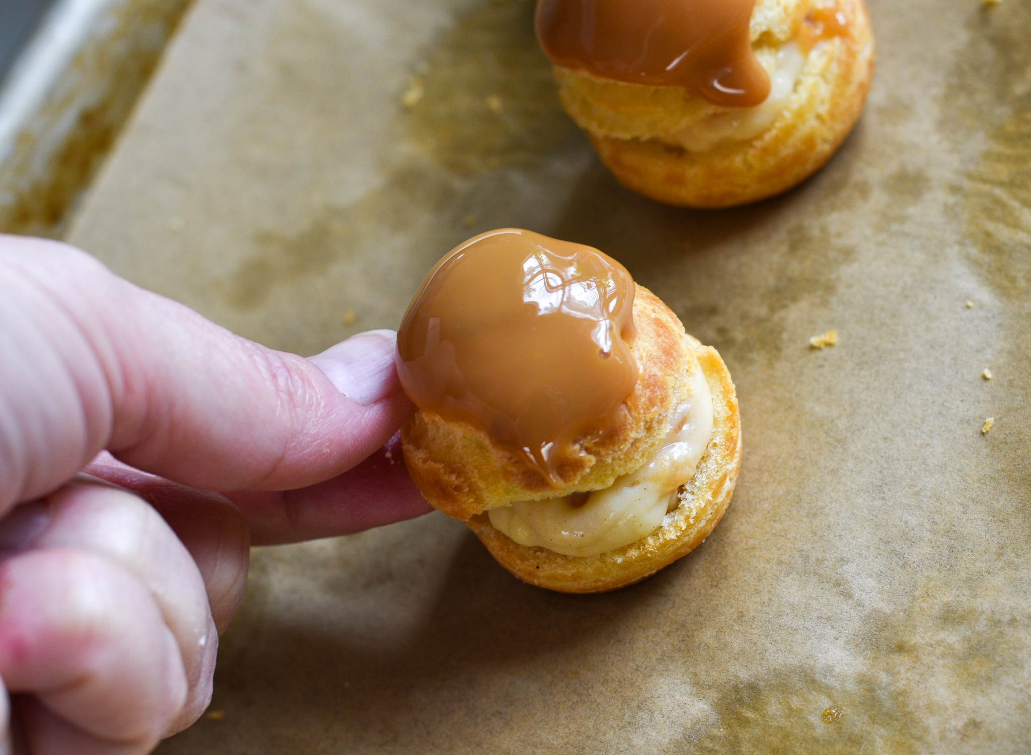 I just took the tops and dipped them upside down in my caramel, then placed them on top of the profiteroles.