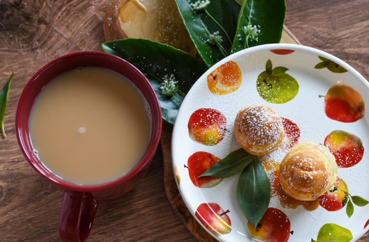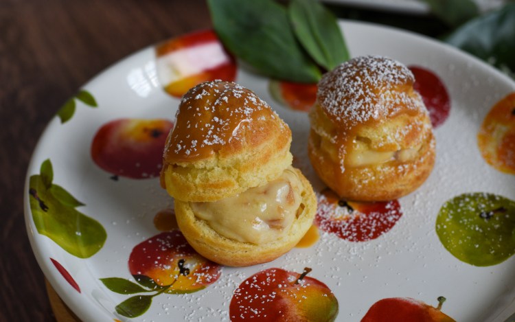 Cut your cooled profiteroles in half, and fill them with the apple pastry cream. I was pretty generous – so generous I ended up having to eat a couple of them with a fork! But it’s so tasty, I couldn’t get enough of it.