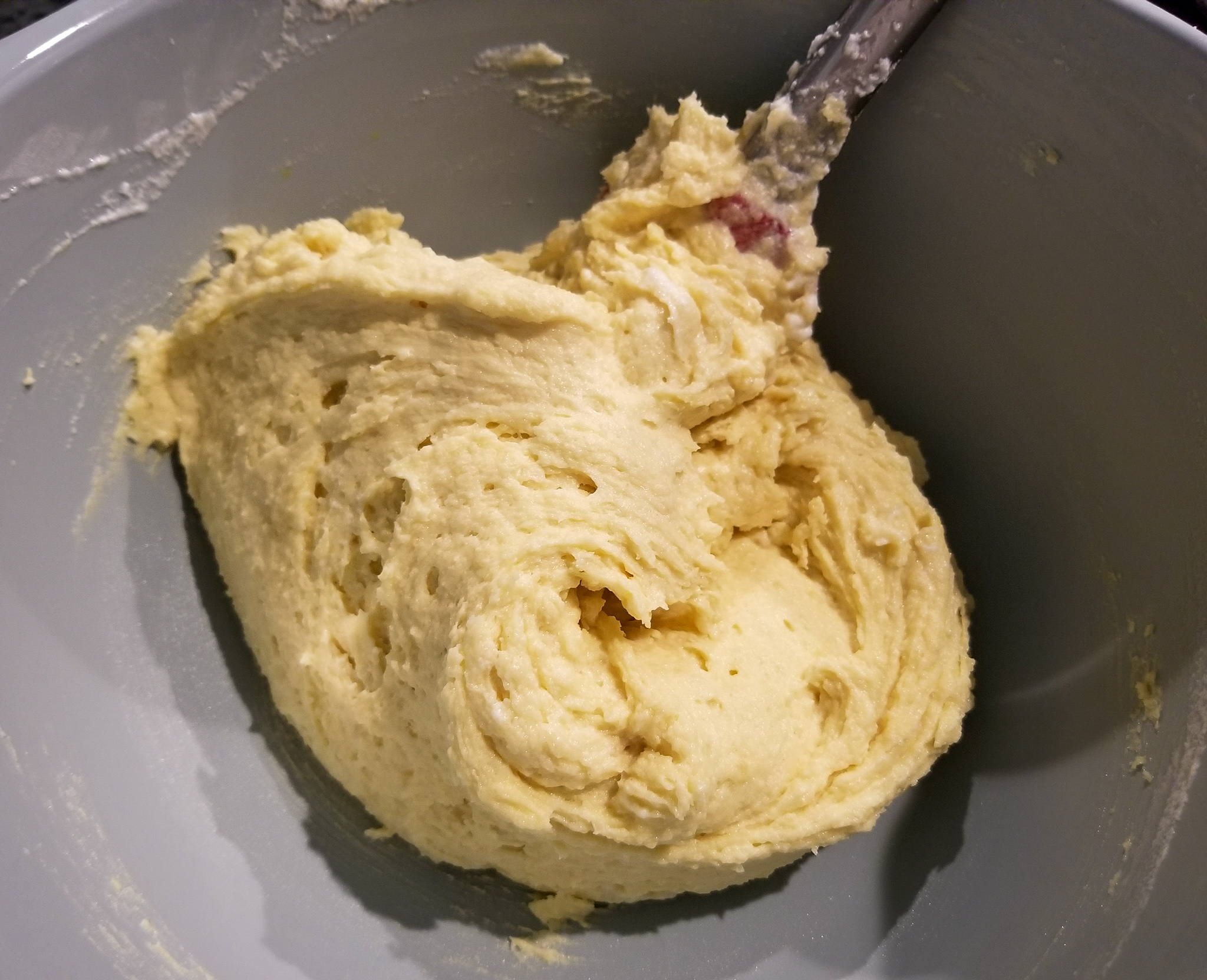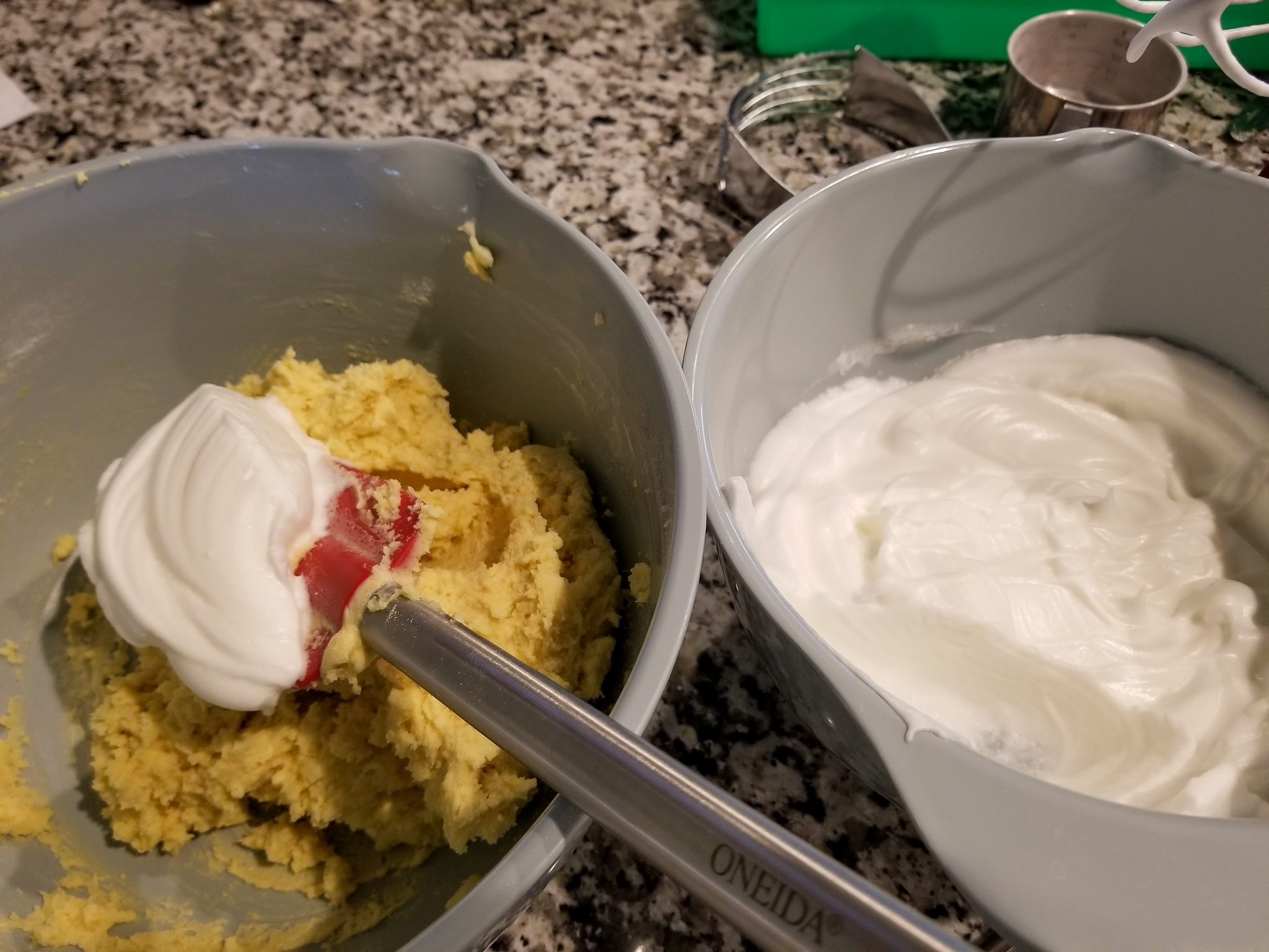 • I also found getting the batter light and fluffy to be a real challenge. The mixture before adding in the egg white was really firm, but even after folding in the egg whites, it seemed still quite firm to me. By the time the egg whites are mixed in, and then you add the food coloring and get the food coloring really mixed in well, it’s hard to believe the egg whites still retain any of their ability to make the batter “fluffy”.