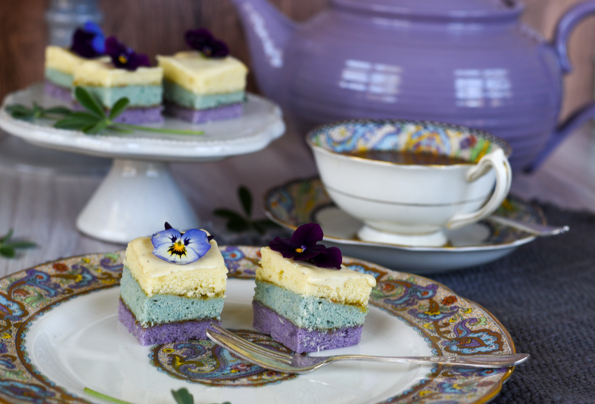I know these are typically done in green, white and red, but I wanted to do something more in line with the colors of spring. I’ve been spending a lot of time in my flower garden of late and I thought adorning my version of these cake-like cookies with an edible viola flower would be a great way to herald in the season for an afternoon spring tea.