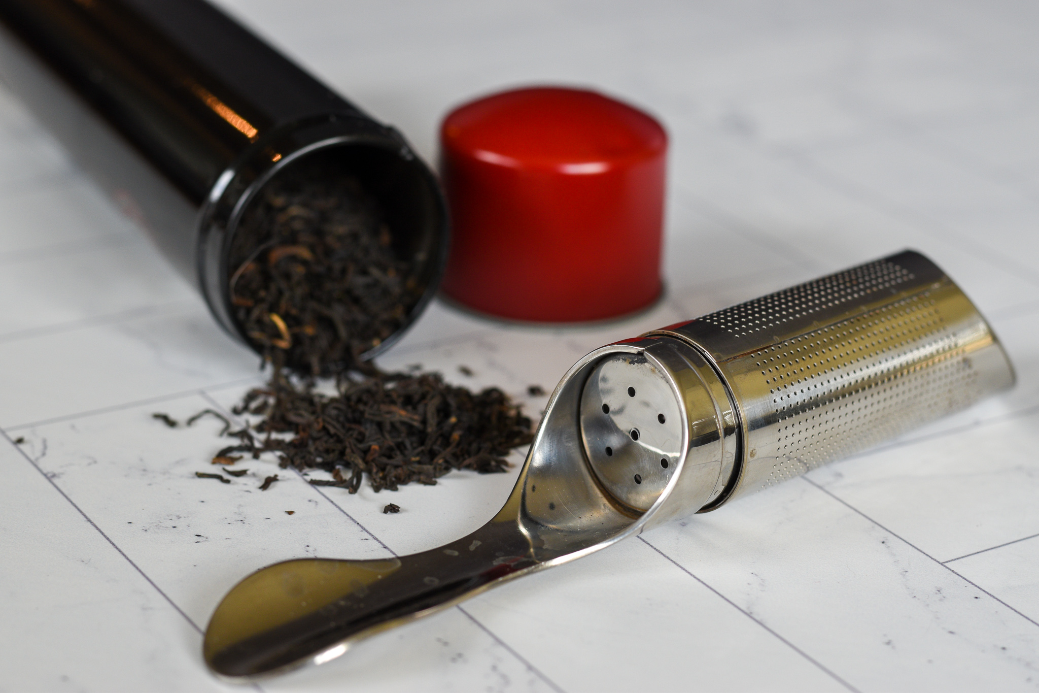It all fits nicely together into about a 3×8-inch package that I can easily slip into my luggage. This particular kit also comes with a strainer, but I tend to go for disposable bags which are lighter and take up less room. There’s enough loose tea in the longer cannister to keep me going for at least a week.