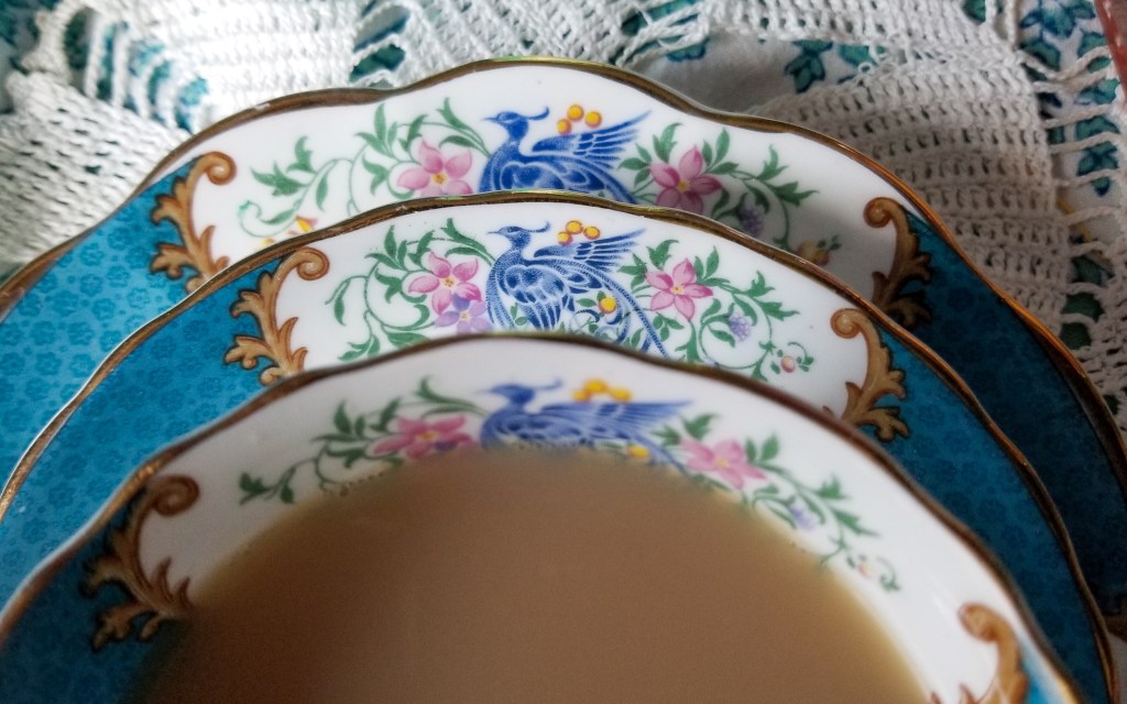 I’d been to Portobello Road antiques markets again on my last trip, and one of my favorite shops is Barham Antiques. I’ve been there several times now – they have an absolutely amazing number of wooden chests and boxes, not to mention a plethora of silver and porcelain items. The last time I was there I’d picked up a tea trio set (=tea cup, saucer and dessert plate), and this time I found another one that I couldn’t resist.