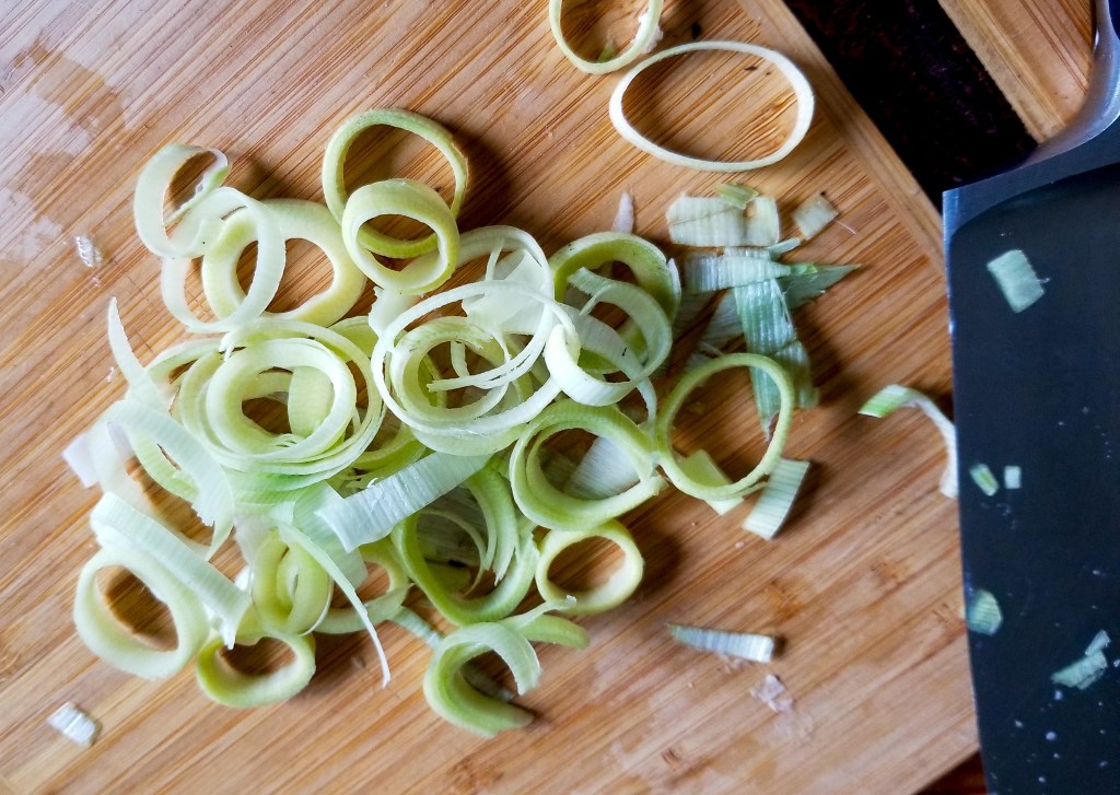 Couple of things that might be helpful as you prepare the ingredients – instead of using spring onions as the original recipe called for, I used leeks. I prepared the leeks by slicing them thinly in rings, then swirled them well in a bowl of water and let them sit for a few minutes to make sure the dirt fell to the bottom of the bowl. Then scooped them out with my fingers and sliced them a little further.