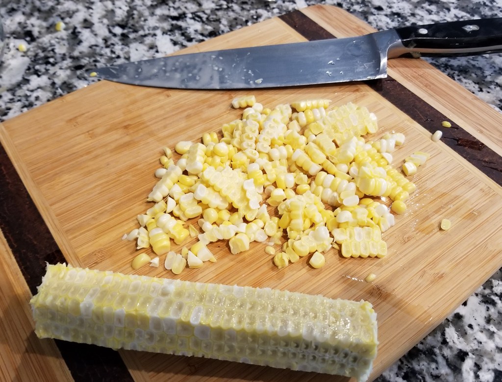 Take your raw ear of corn and slice off the kernels. Add another tablespoon of olive oil into the same saute pan and add the corn kernels, cooking them for a couple of minutes, or until they start to char just a bit. Set aside.