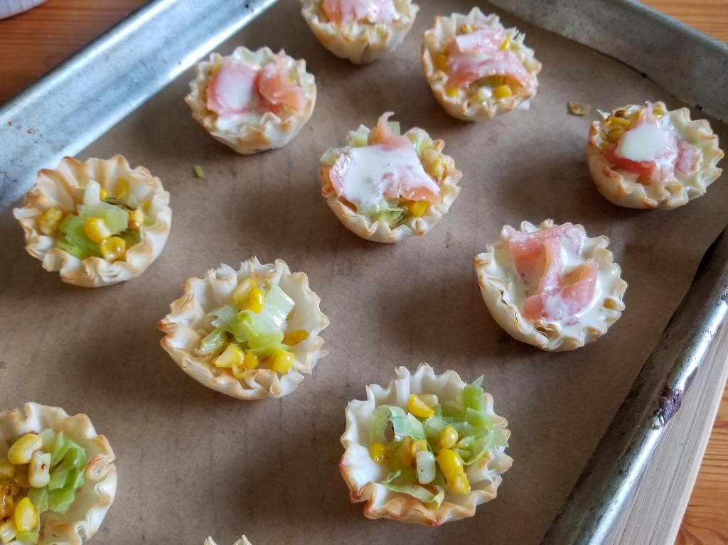 I used a little olive oil in a small pan to first saute the leeks until they started to soften, then the corn until it got a nice char on it. That added some good flavor to both before I added the ingredient into the tartlets.