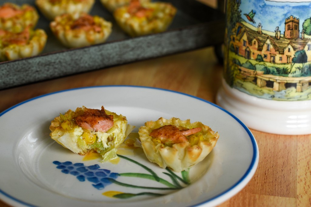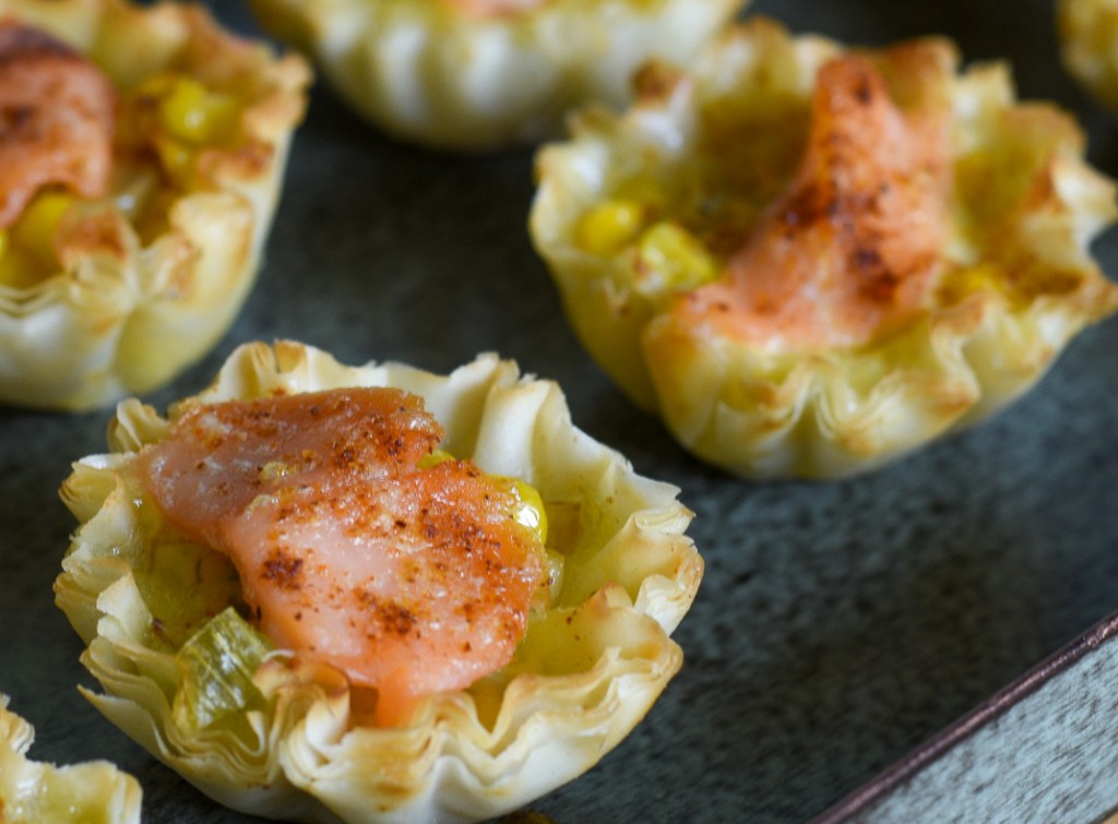 To assemble the tartlets, first add a bit of leek, corn, and salmon on top. Use the rest of the ingredients to fill as many tartlets as you can (should fill about 24-28 mini-tartlet cups). Pour the cream/egg mixture over the top of each tartlet to fill each one, making sure they are not overfilled so the mixture drips over the side. Finally, sprinkle with a little dusting of cayenne pepper.