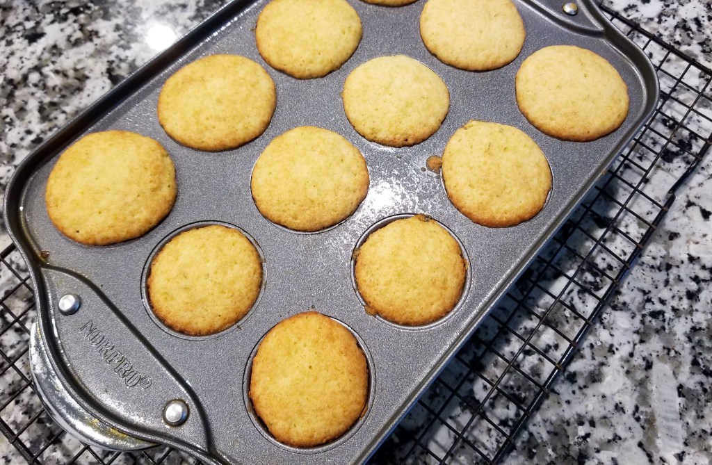 Divide batter among the wells in your prepared pan (fill each well at least 3/4 full, and kind of pat it down and smooth the top as much as you can so they are all evenly prepared). Bake until a wooden pick in the center comes out clean; with these mini cakes, start at 15-20 minutes, checking after 15 (you want them slightly golden brown on the top). Let cool in the pan for 10 minutes, then remove from pan (running a knife around the pan to loosen if needed), and let cool completely on wire racks.