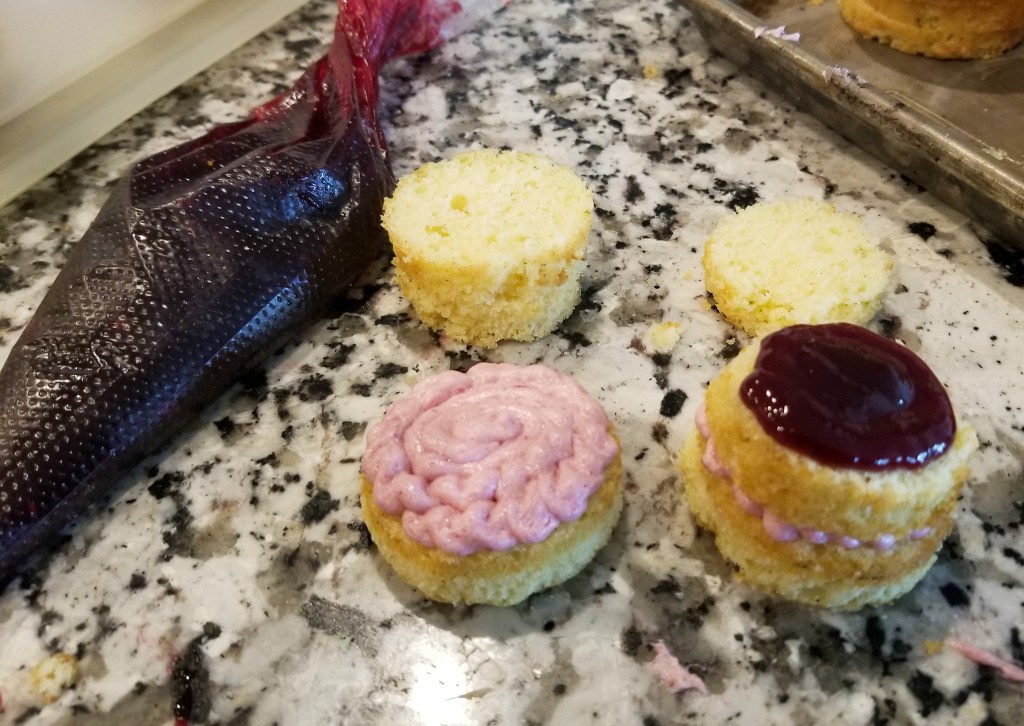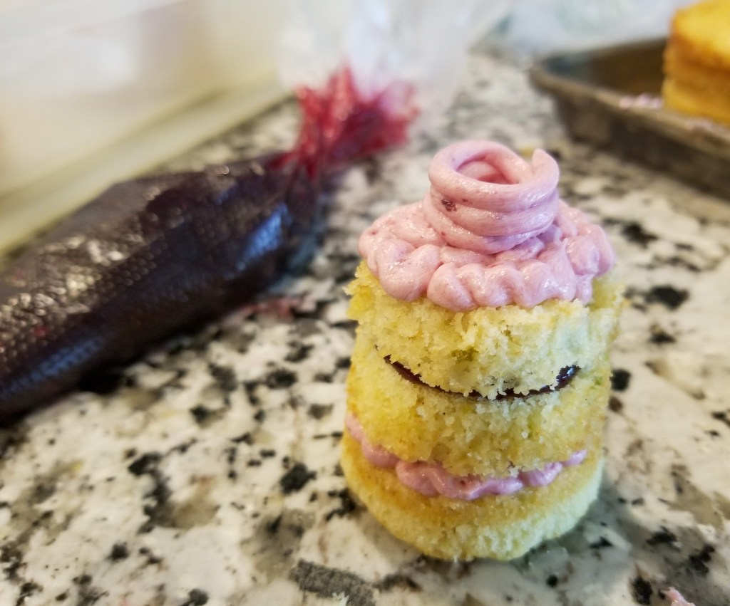 Then just start your assembly line, buttercream in the bottom layer, then a good dollop of the blackberry coulis in the second layer. You can just dollop the center with the coulis, as it will spread out a bit when you put the top layer on. Then finish with more buttercream. I did pipe a little round “well” at the top that I could put another dollop of coulis in on the top.