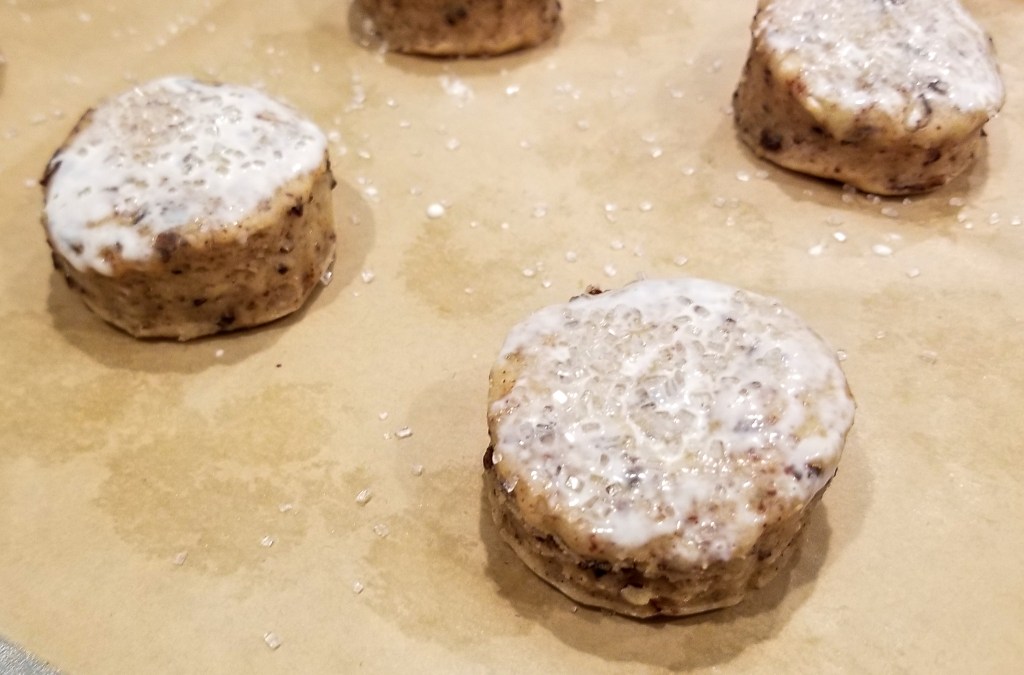 Then before baking, finish them off with a brushing of the heavy cream and some sparkling sugar. The sparkling sugar is one of my favorite touches, which you can probably tell if you see other scones on my blog!