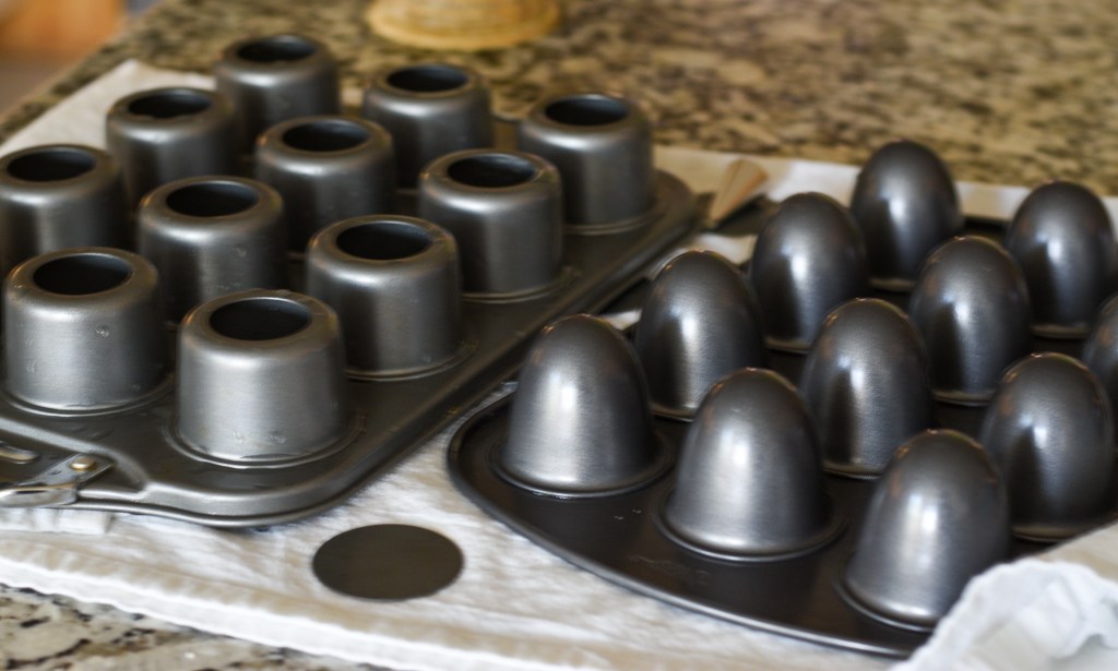 On to the recipe, which came from Taste of Home. In order to make it in mini-form, I actually tried two forms (shown below) – the one on the left is the Norpro Mini Cheesecake tin with the removable bottoms – this tin worked the best for this recipe. I also tried it in the Wilton 12-cavity cake pop pan on the right, though the recipe is written for the one-and-a-half inch rounds of the Norpro cheesecake tin. (More about the results with the cake pop pan below the recipe.)