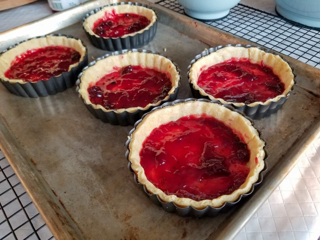 I mostly followed the recipe for Sour Cherry Bakewell Tart at Eat Live Escape. For my version I went for 4-inch versions; the ingredients for a 9-inch single tart are more than sufficient for 5 this size. I like the look of the fluted tart, and recommend as well using the kind with removable bottoms. I did a very light spray with cooking spray, as well as having a piece of parchment on the bottom of the tart – they came out very easily once baked.